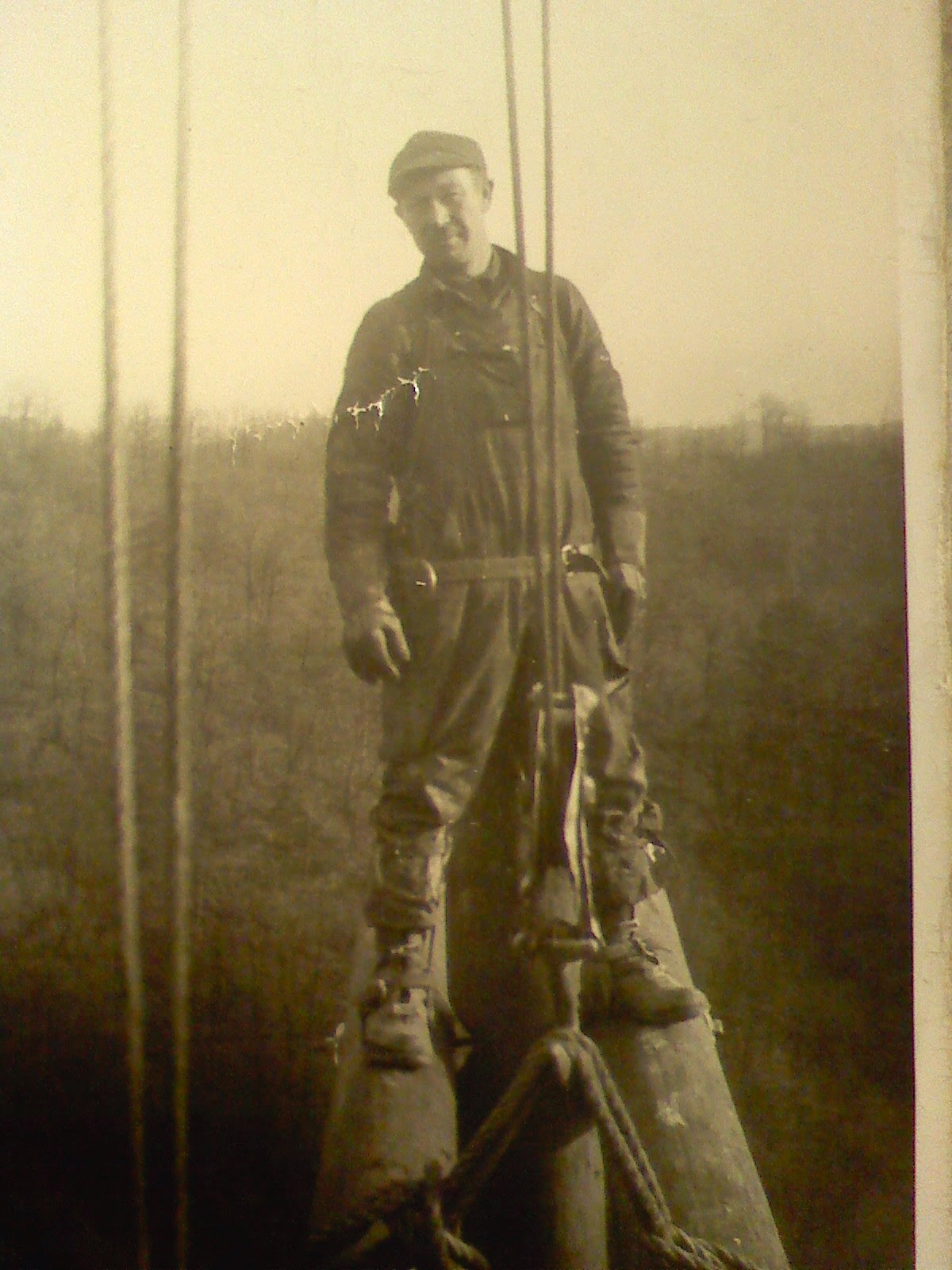 This is my grandfather, Ralph Ransom. As you can see, he was a lineman, as was my father and uncle. My grandfather was electrocuted in 1948 — and survived. He lost both legs and had limited use of his left arm. But, he lived a very full life after the electrocution. He didn’t have prosthetic legs until approximately five years after the accident. But he drove a three-wheeled motorcycle to work everyday and hunted and fished. — RUTH RANSOM BROWN