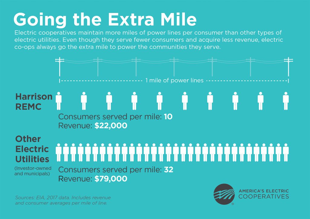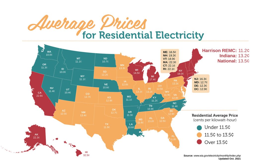 Since the REMC operates on a not-for-profit basis, these low operating costs translate into lower electric rates. As shown in the chart below, our rates are lower than the state average and national average when compared to all electric utility companies. Now consider the fact that electric cooperatives provide service to more rural areas of the country than investor-owned utilities and municipals do. When a cooperative like Harrison REMC (10 members per mile of line) can provide rates equal to or lower than other municipal and investor-owned utilities (32 customers per mile of line) at any use level, you can be assured that the local cooperative not-for-profit model is working for you.