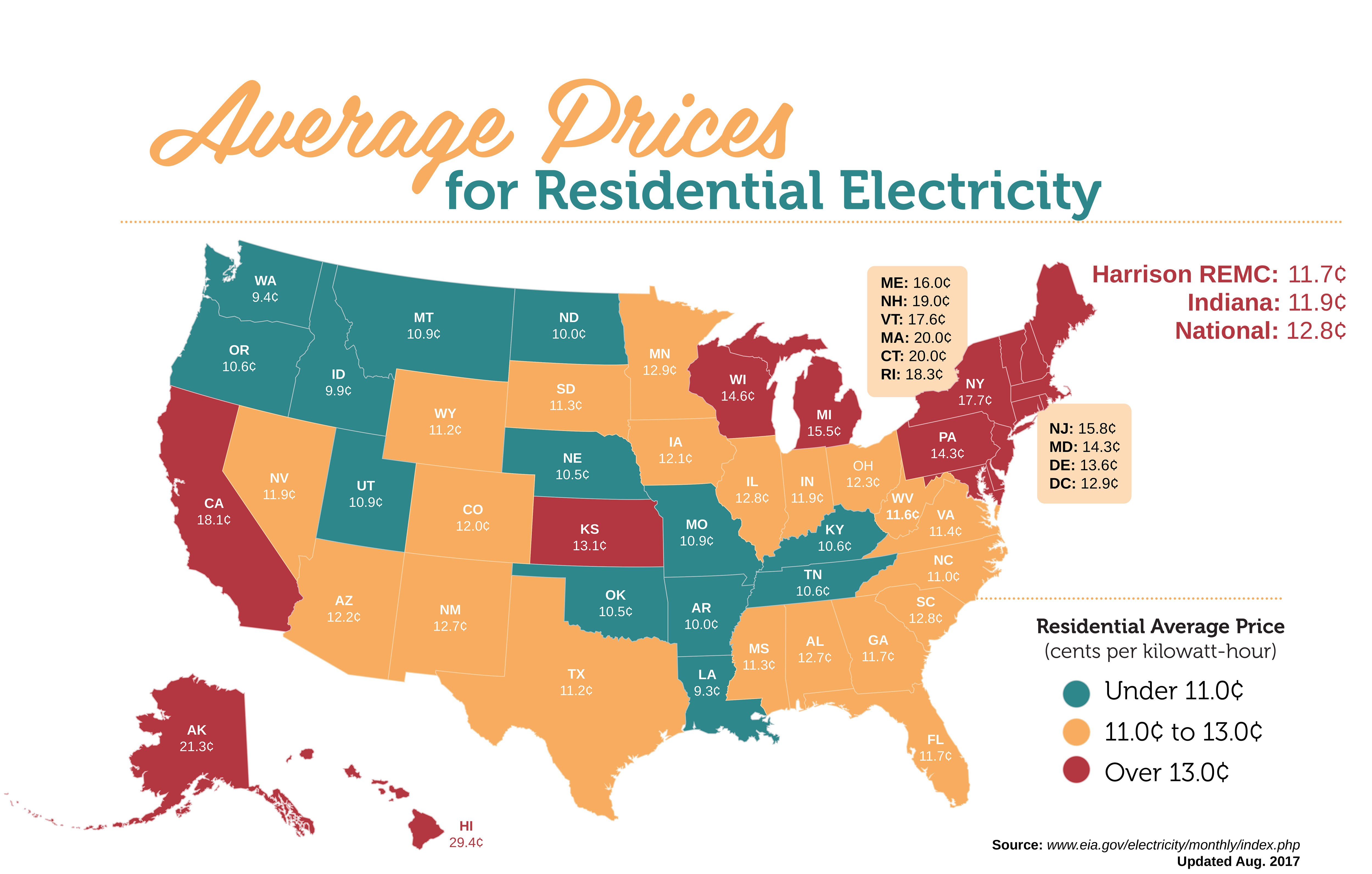 The cost-of-service study mentioned above indicates a basic service charge of $43.31 is needed to cover the actual fixed cost incurred by the REMC. Our current basic service charge of $20 per month is the lowest in the state based on a recent state survey. With the increase of $2.50, Harrison REMC will still have the lowest basic service charge in the state. The current state average is $29 per month, and the highest is $44 per month.