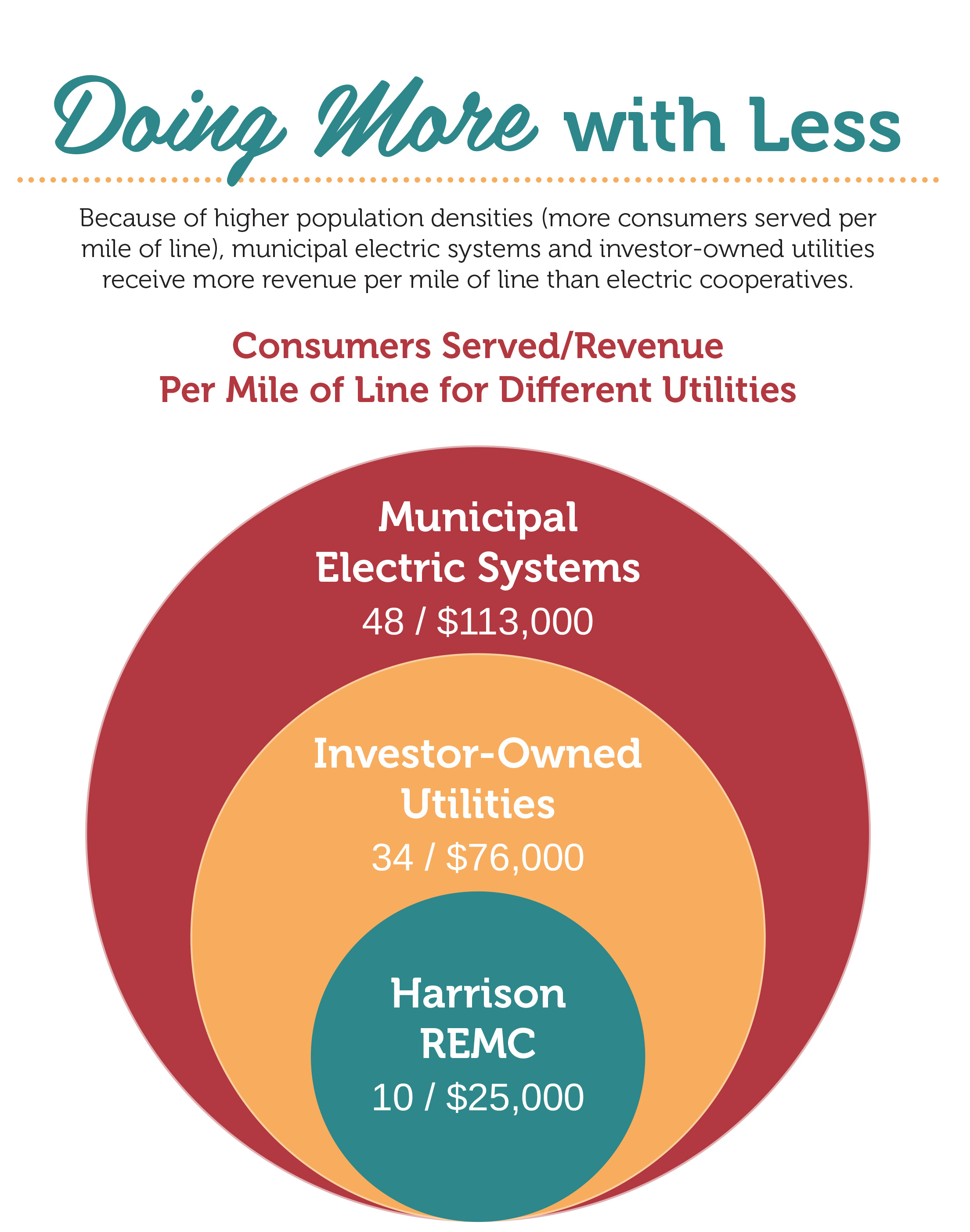 Since the REMC operates on a not-for-profit basis, these low operating costs translate into lower electric rates. As shown in the chart on the top of the next page, our rates are lower than the state average and national average when compared to all electric utility companies. Now consider the fact that electric cooperatives provide service to more rural areas of the country than investor-owned utilities and municipals do. When a cooperative like Harrison REMC (10 members per mile of line) can provide rates equal to or lower than investor-owned utilities (34 customers per mile of line), and municipal-owned utilities (48 customers per mile of line) at any use level, you can be assured that the local cooperative not-for-profit model is working for you.