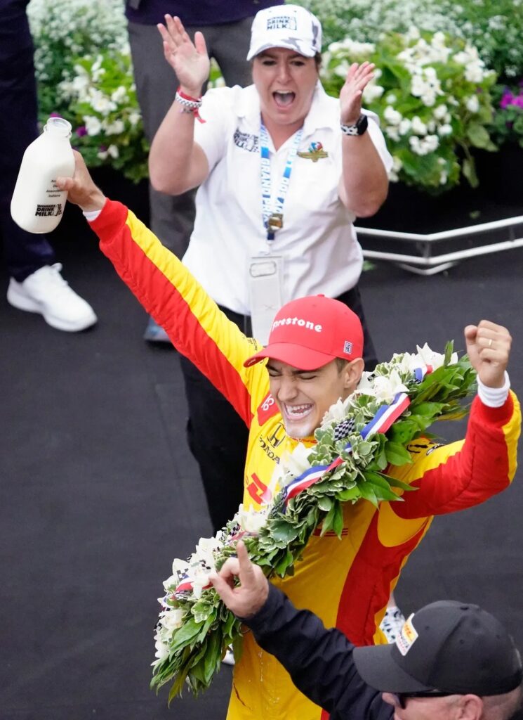 Abbie Herr cheers after presenting Indianapolis 500 winner Alex Palou with his celebratory glass of milk.
