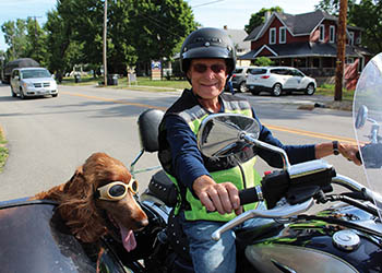 Now, Schwab and Bailey can be found together every morning at their favorite coffee shop, Genesis House in Antwerp, where they come roaring in on motorcyle and sidecar — Bailey’s long, shaggy ears and tongue flapping in the wind — to their curbside spot, ready for a nonfat mocha with an extra shot of espresso.