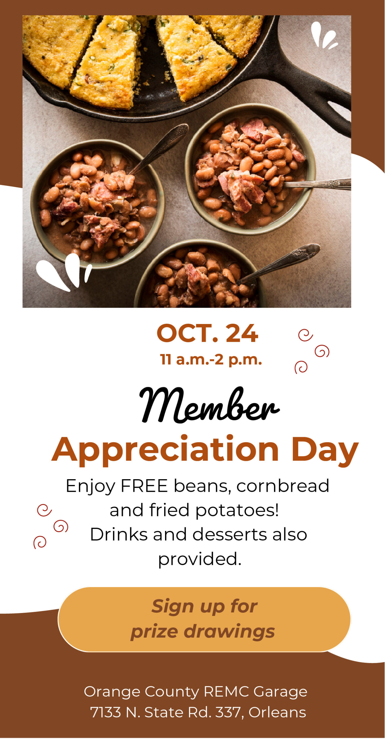 Member Appreciation Day By Indiana Connection Posted on Oct 16 2025 in Orange County REMC Member Appreciation DayOct. 2411 a.m. – 2 p.m. Related Stories Apply today for 2026 Page Day Apply now for the Indiana Youth Tour 2026! Seeking artwork for Cooperative Calendar Contest