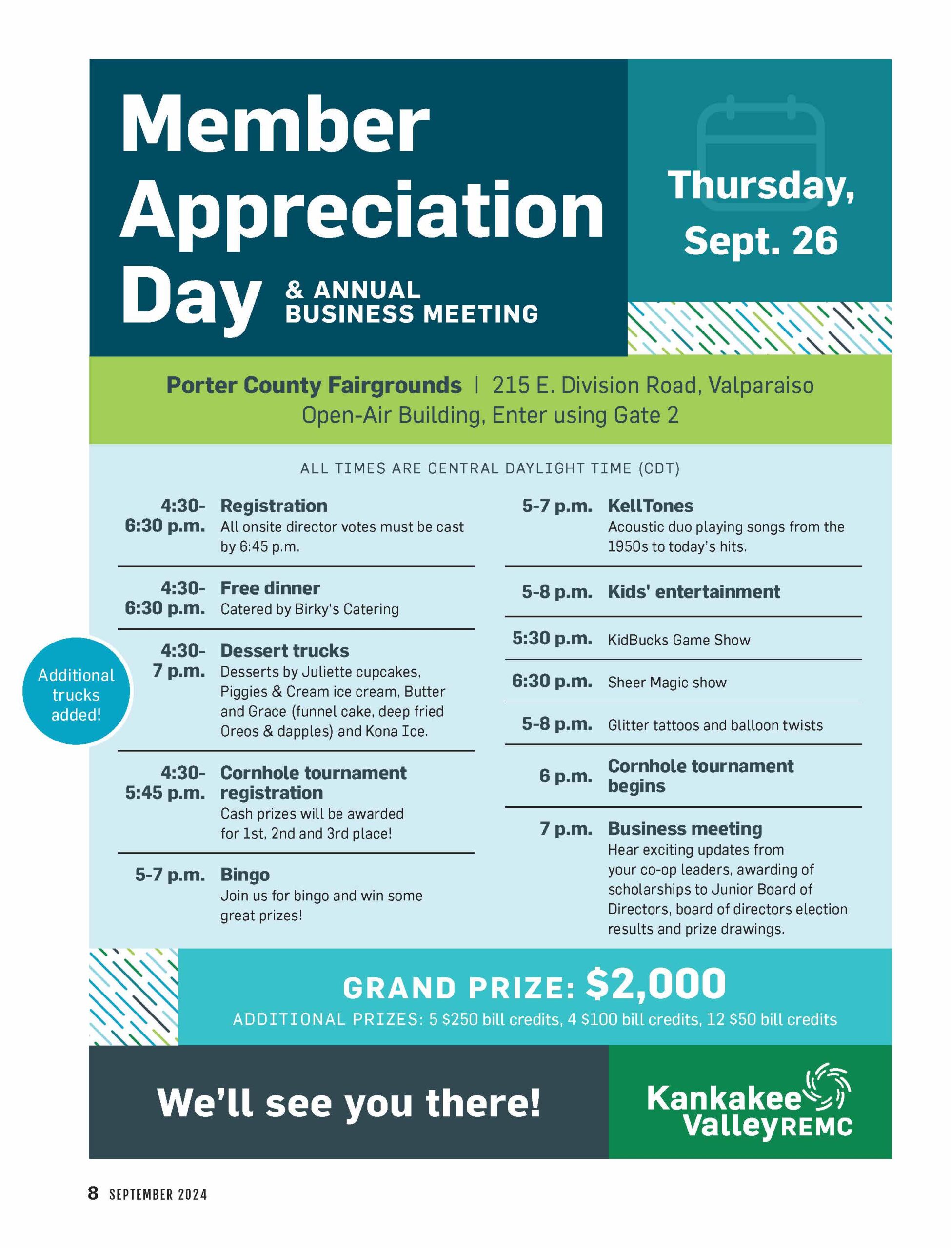 Member Appreciation Day and Annual Meeting is Sept. 26 By Indiana Connection Posted on Sep 03 2024 in Kankakee Valley REMC Related Stories Smart energy choices, shared savings KV REMC 2026 Scholarship opportunities Water heater switch program discontinues Jan. 1