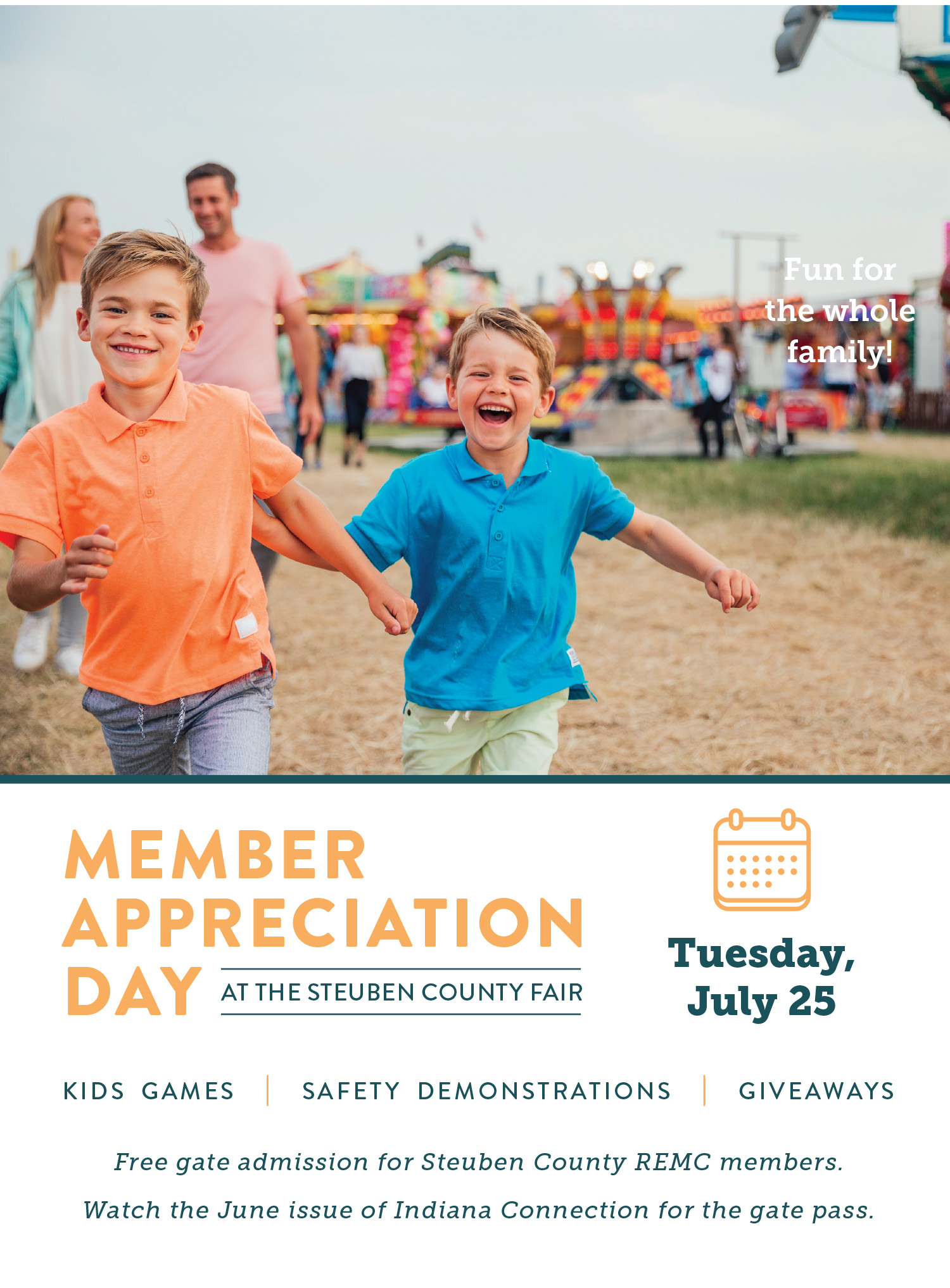 Member Appreciation Day is July 25 By Indiana Connection Posted on May 08 2023 in Steuben County REMC Related Stories Want to serve your community? Broadband internet for your home and business from Steuben County REMC Calendar
