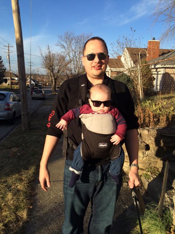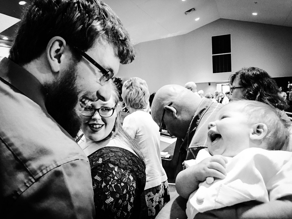 At first, Kathie Ponder’s son was afraid to take his newborn to church for fear of him crying. But here, Steven (infant) and dad Brenden Ponder smile at church.