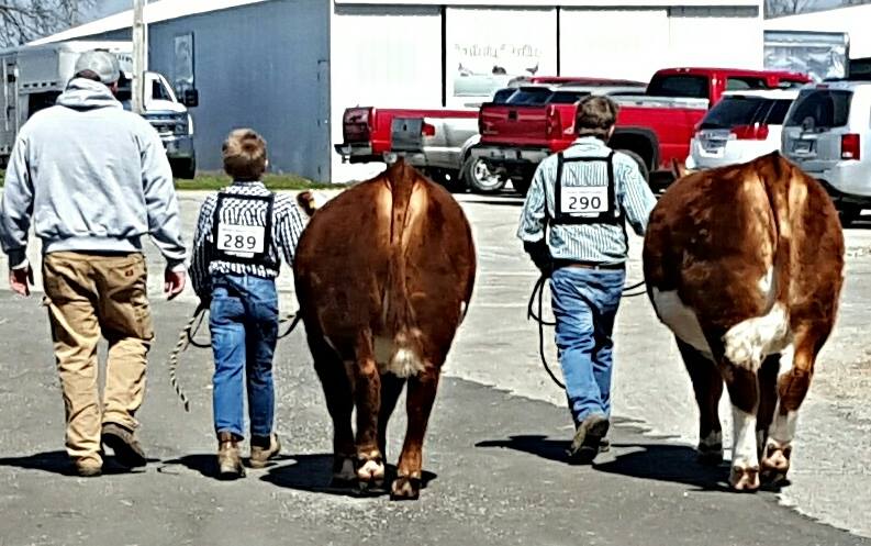 Richard Drake from French Lick, Indiana, and his sons, Ivan and Ian, get ready to show their calves at Columbus, Indiana.