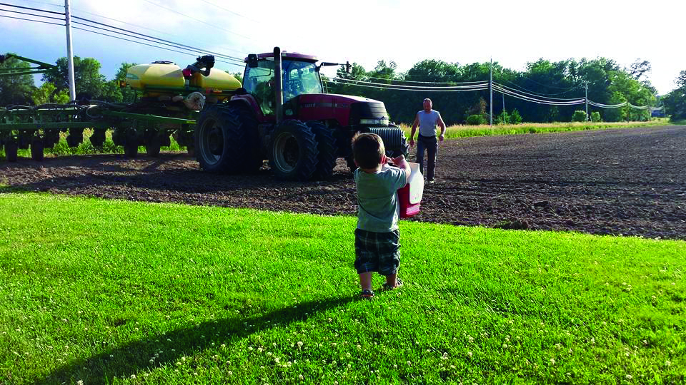 Silas Shake carries supper to his dad, Lucas Shake, in their field in Linton, Indiana.