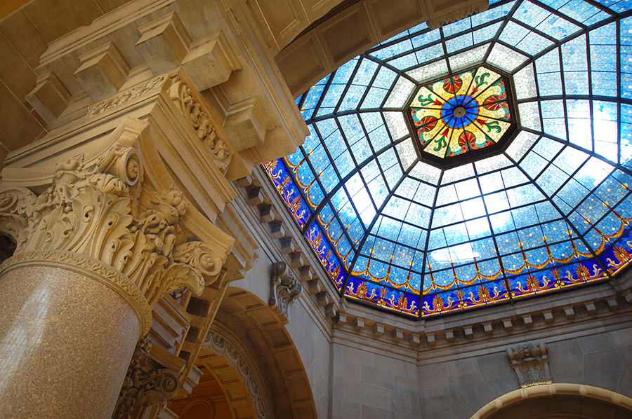 View of the mosaic stained glass ceiling, Indiana state capitol building, Indianapolis, Indiana. Photo inside the Indiana State Capitol Building by lenzjona, iStock/Getty Images Plus