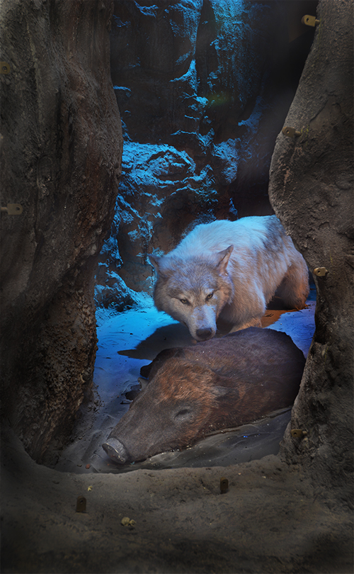A dire wolf attacks a peccary in a pit where both will eventually perish in a recreation of animal life in the Indiana Ice Age some 13,000 years ago. An excavation by the state museum of the death pit in a cave in Southern Indiana found the bones of both animals among others. The exhibit’s pit walls are cast from the actual walls of the excavation site. Photo by Richard G. Biever