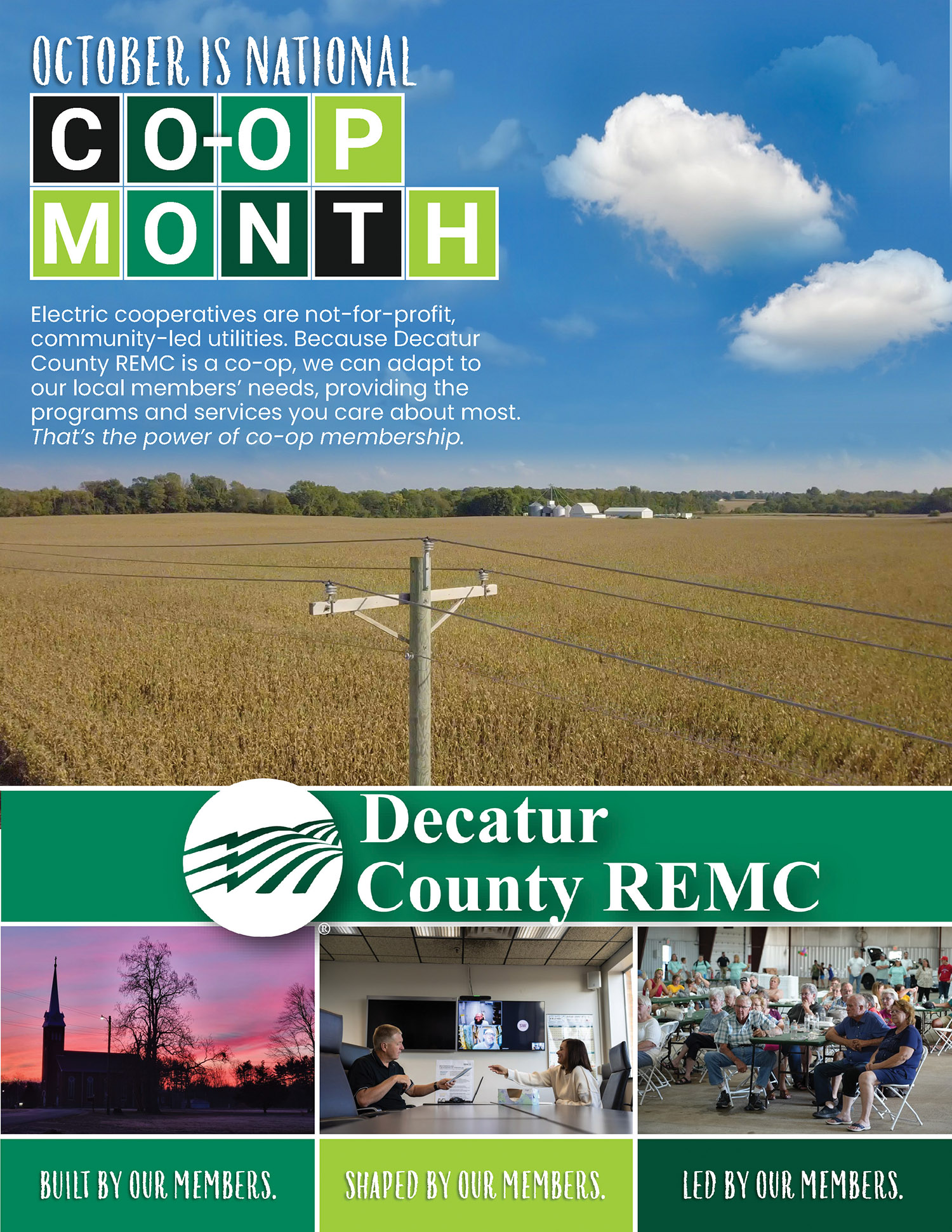 October is Co-op Month By Indiana Connection Posted on Oct 03 2024 in Decatur County REMC Related Stories Unclaimed capital credits Powering progress Join us for Cocoa and Cookies on Dec. 16