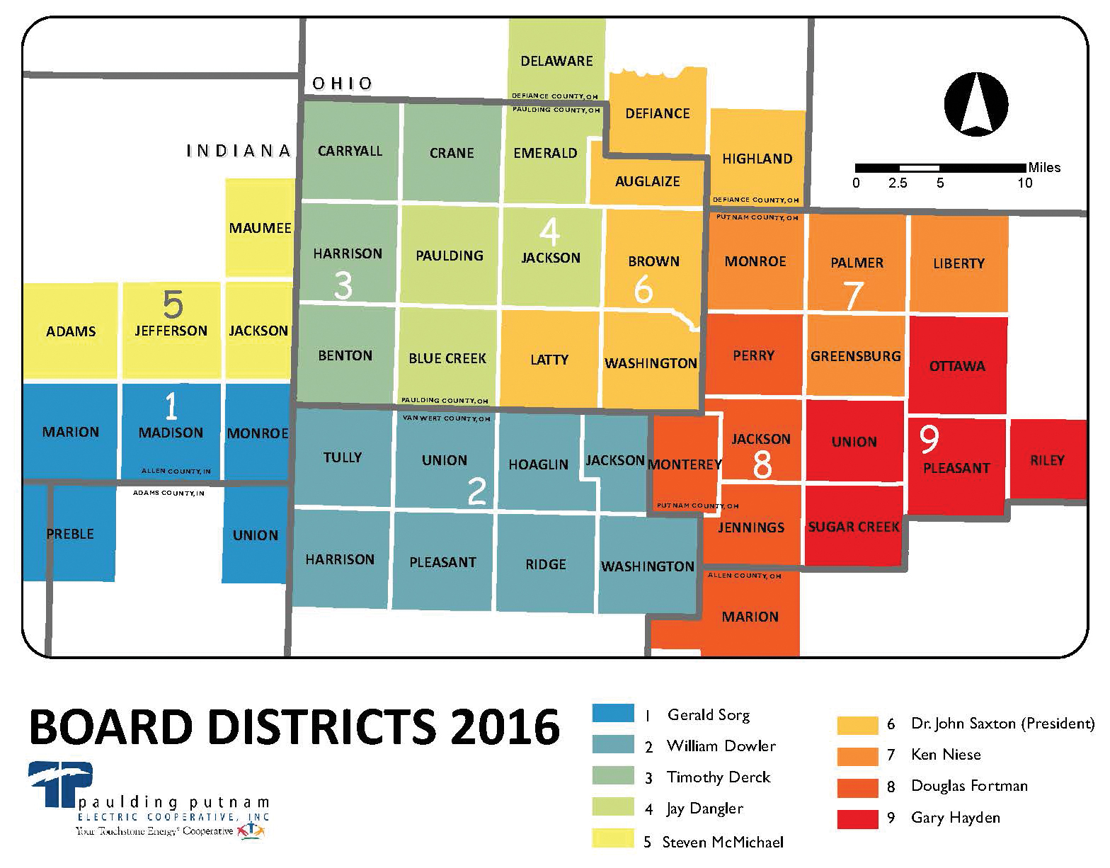 The Paulding Putnam Electric Cooperative board of trustees consists of nine co-op members who each represent one district within the territory served by Paulding Putnam Electric Cooperative (PPEC).