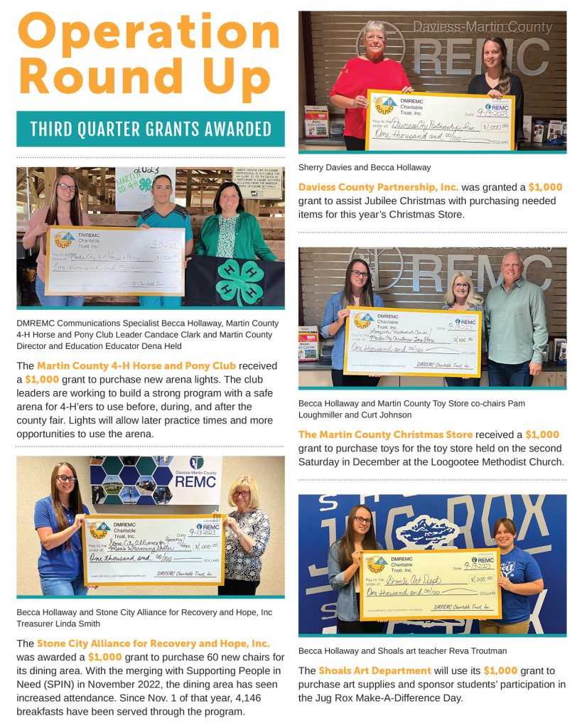 Operation Round Up Grants Awarded By Indiana Connection Posted on Nov 18 2023 in Daviess-Martin County REMC Related Stories Hoosier Energy advances pollinator habitat conservation efforts The season of giving UPCOMING YOUTH PROGRAMS FOR 2026
