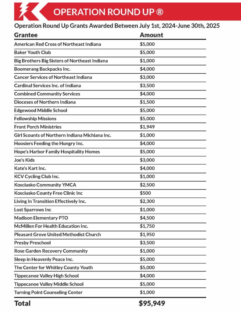 Operation Round Up report By Indiana Connection Posted on Sep 21 2025 in Kosciusko REMC Related Stories Reflecting on 2025, building for 2026 Welcome to the season of gratitude and reflection Take on that fall home improvement project and save!