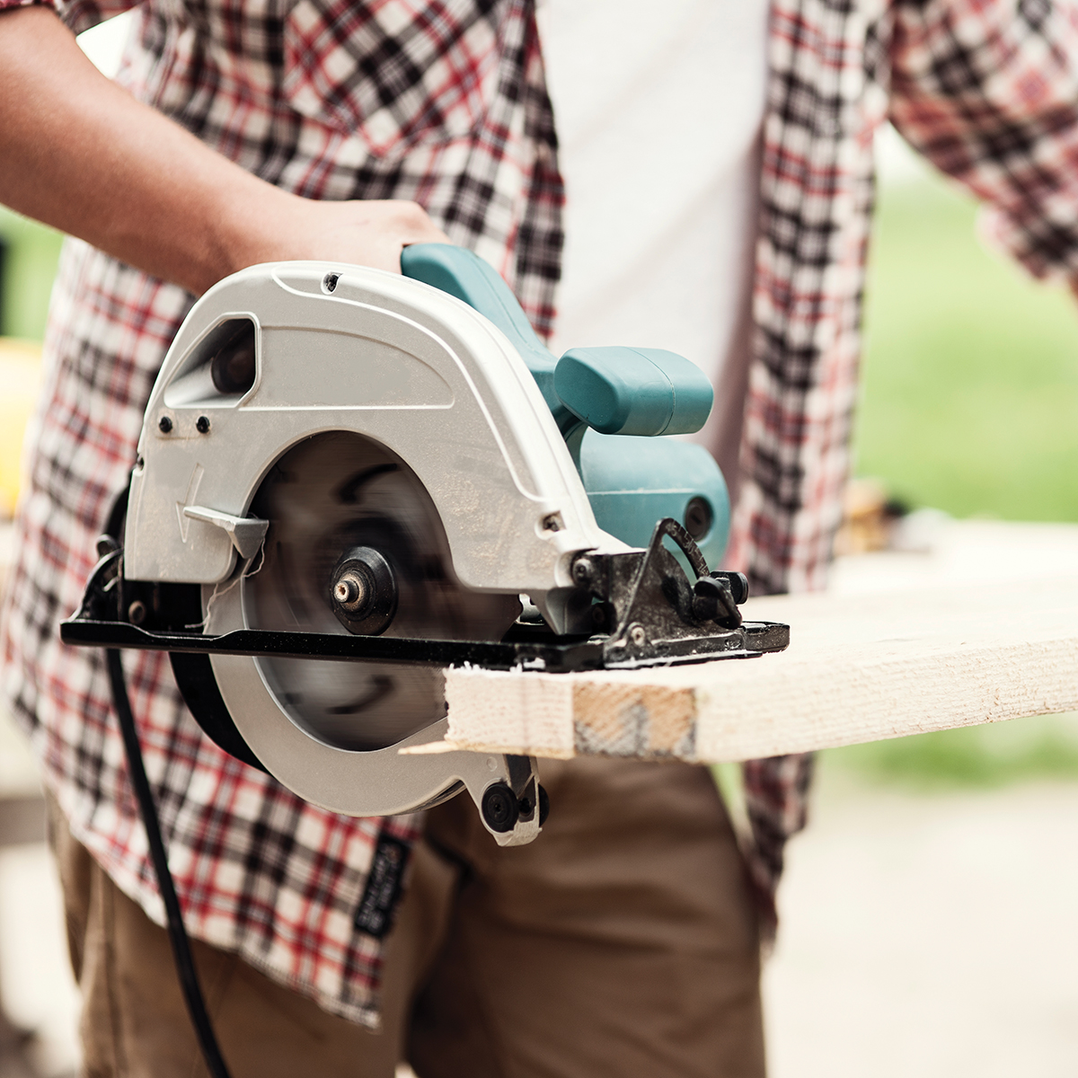 Close-up of carpenter cutting a wooden plank
