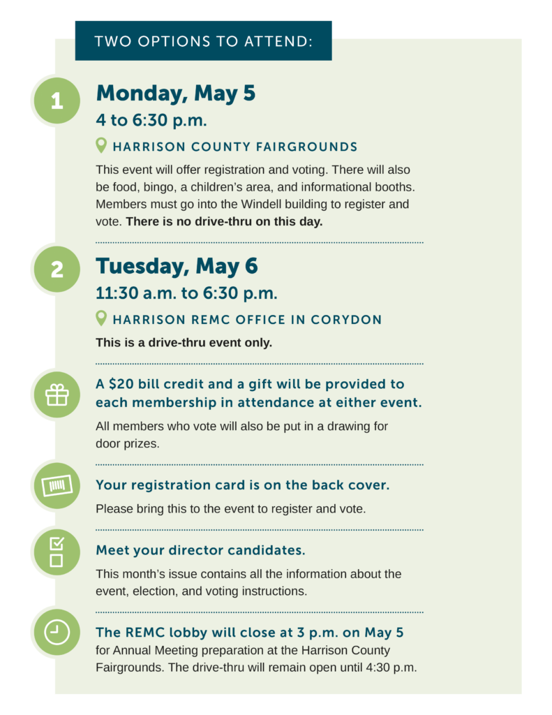 Please join us at your Annual Meeting By Indiana Connection Posted on Apr 09 2025 in Harrison REMC Related Stories A season of gratitude and community Holiday hours 2025 Time of day hours
