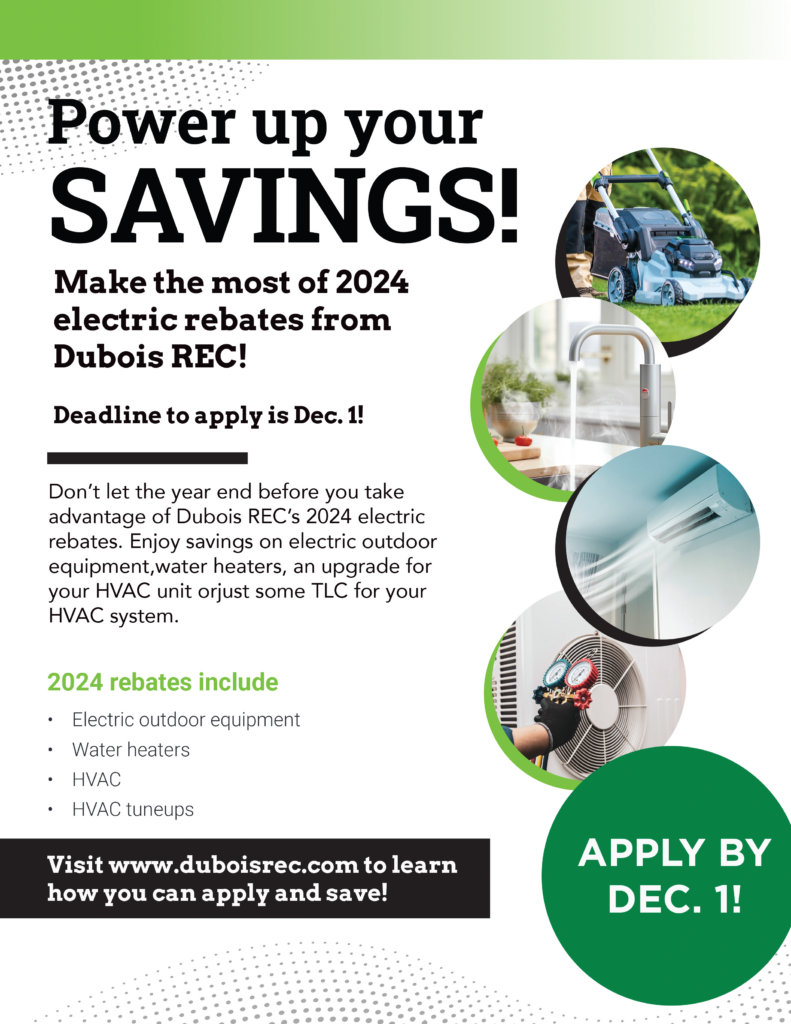 Power up your savings with rebates By Indiana Connection Posted on Nov 23 2024 in Dubois REC Related Stories Hoosier Energy advances pollinator habitat conservation efforts Home lighting 101 Capital credits FAQs