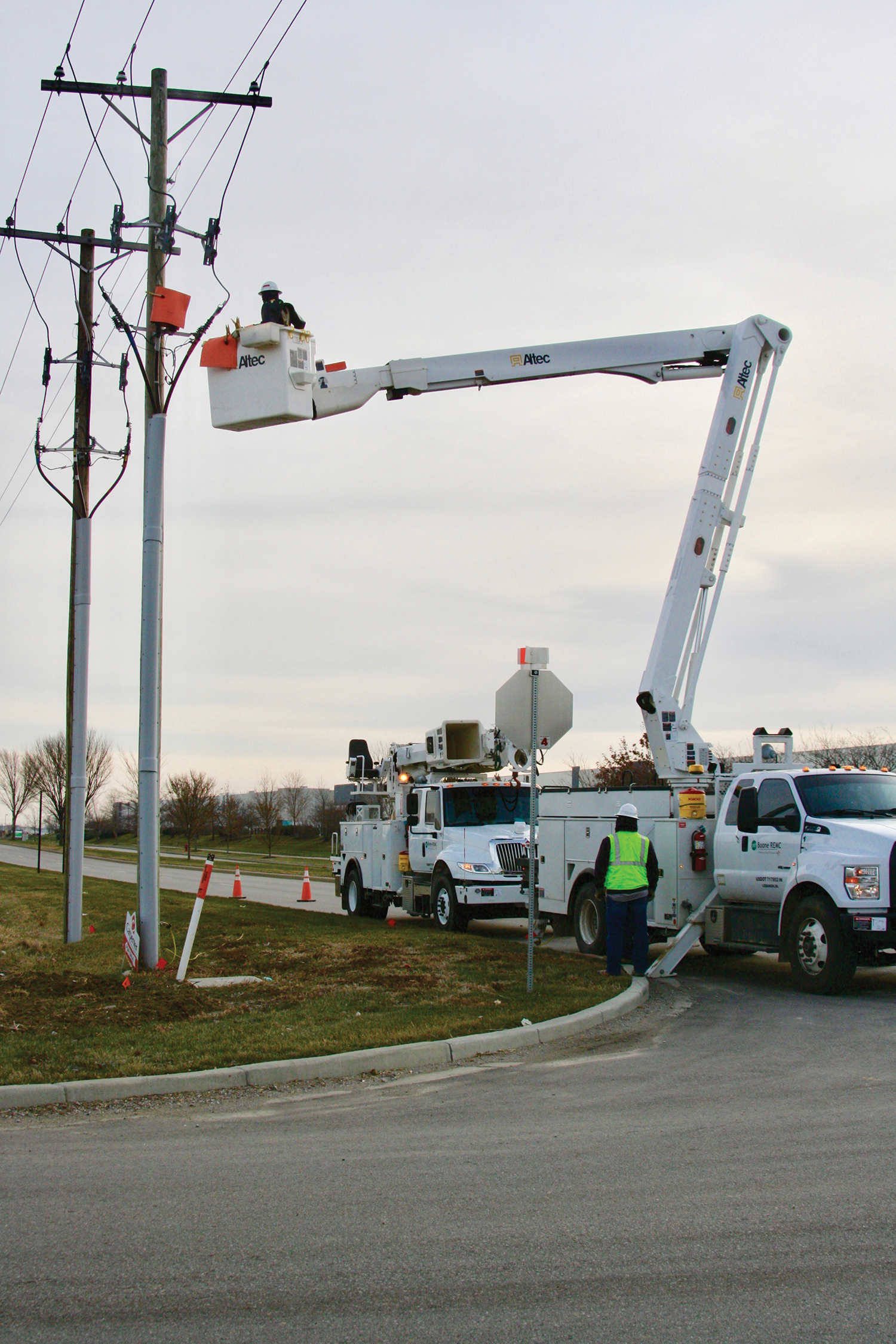 Linemen Nick Shepherd, Chad Revell, Shane Gann, and Jason Labrie work on a transformer in Perry Industrial Park. There are already four new projects proposed for 2020 in this park with four lots remaining for new proposals. Linemen Clayton Akers and Jason Limp perform maintenance on overhead cable in Allpoints Business Park, which already has four proposed projects for 2020.