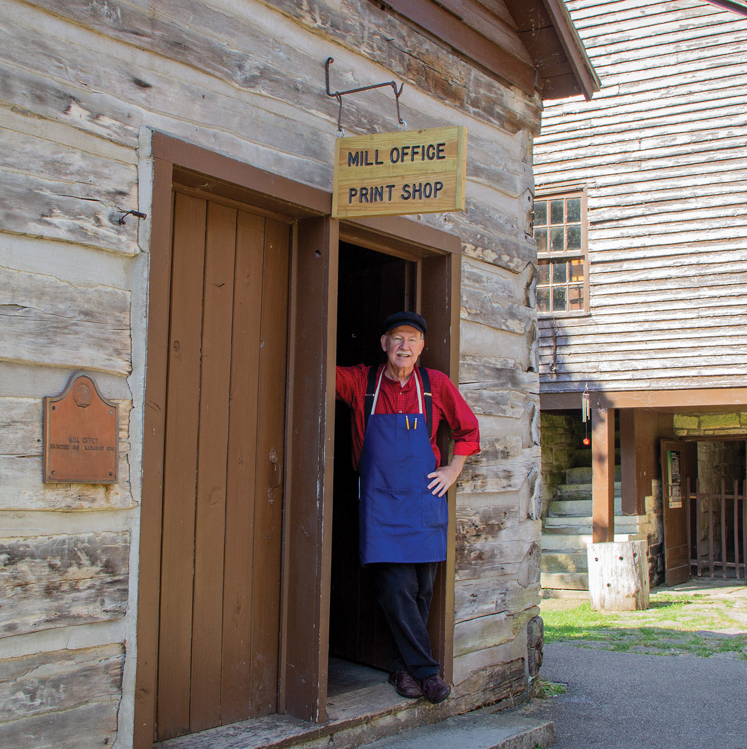 If you would like to visit Paul Sanders or his apprentice, the Pioneer Village is open from May through mid-October from 9:00 a.m. to 5:00 p.m. The print shop is located on the southwest side of the mill next to the school and Pioneer Garden.
