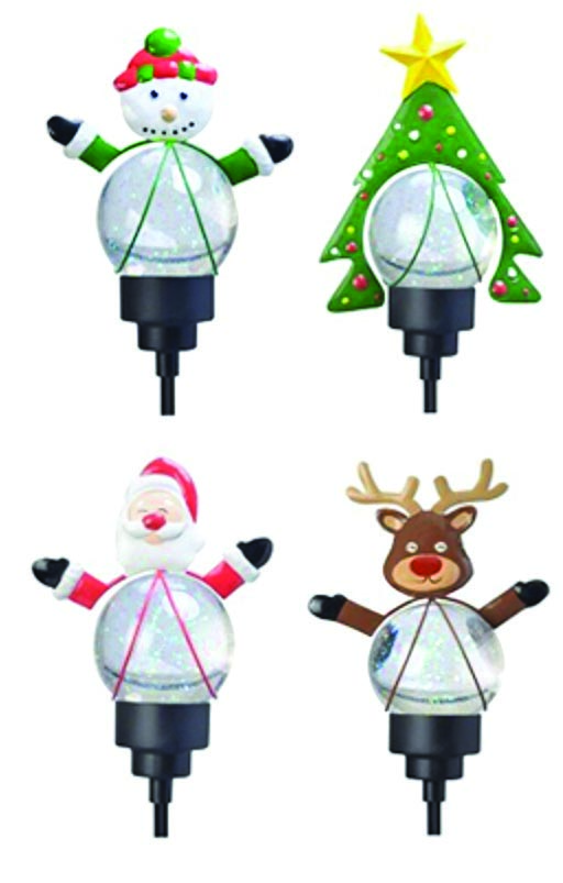 The lawn and garden decorations are plastic globes mounted on a metal stake that can be inserted into the ground. Water and antifreeze allow glitter inside the globe to float. The winter-themed light stake is framed by a snowman, Christmas tree, Santa Claus or reindeer. The solar powered lights also contain LED bulbs that run on rechargeable batteries.