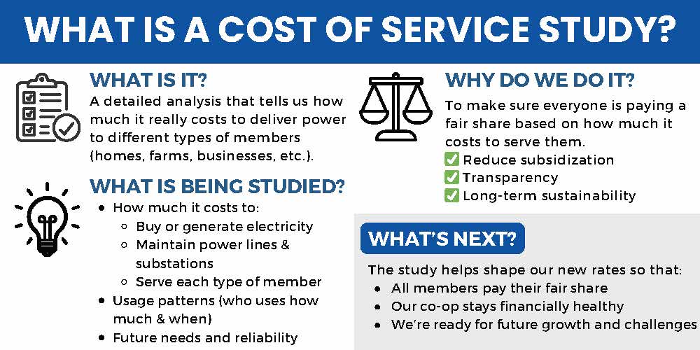 Earlier this year, Clark County REMC engaged an independent rate consultant to perform a Cost-of-Service Study. In plain terms, its a deep dive into our finances and operations that examines what it truly costs to serve each member category, from homes to small businesses to larger commercial accounts. The study looks at everything from system maintenance and outage response to cybersecurity and future infrastructure needs. Its thorough, methodical, and designed to give our cooperative a fact-based picture of where we stand.