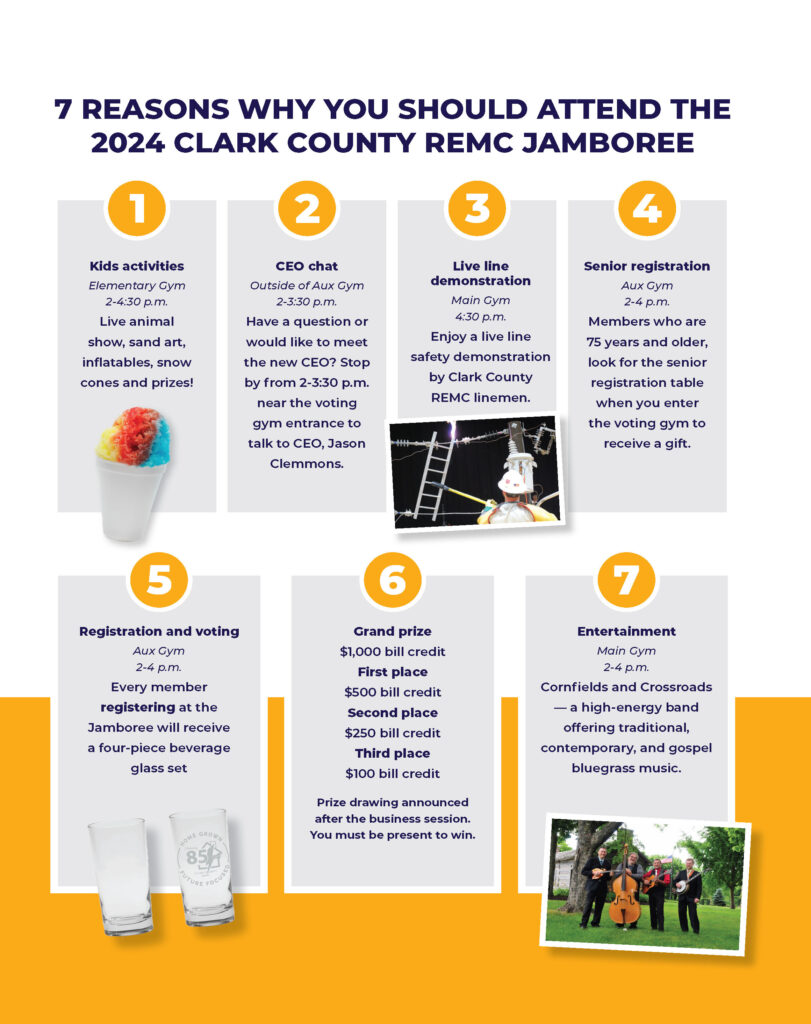 Reasons to attend the 2024 Clark County REMC Jamboree By Indiana Connection Posted on Mar 17 2024 in Clark County REMC Related Stories Hoosier Energy advances pollinator habitat conservation efforts Providing reliable service while staying financially strong Donate to our food drive