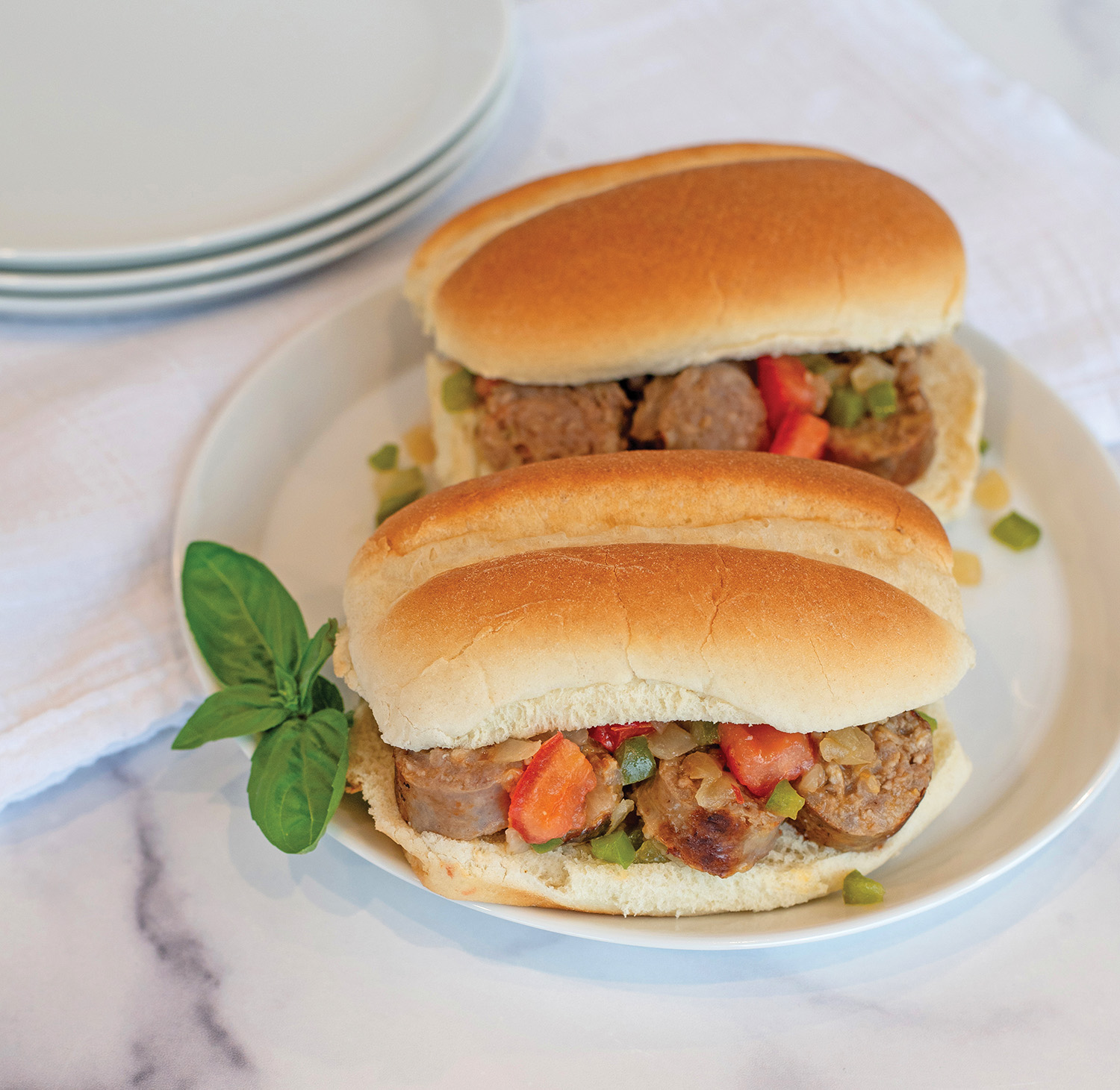 Cook sausages in a large skillet over medium heat until no longer pink, about 10 minutes. Drain. Remove the sausages and slice them into half-inch pieces, then return to the pan. Add the frozen vegetables. Cover for 10 minutes until vegetables are tender. Add tomatoes and seasonings and cook for 2 minutes. Hollow out the bottom of the buns/rolls. Fill with the cooked sausage mixture and serve.