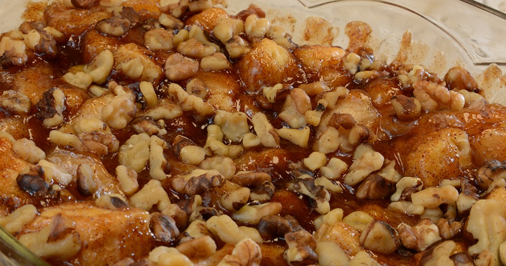 In a saucepan, melt butter. Stir in brown sugar, apple pie filling, cinnamon and vanilla. Spread half of the apple mixture in a 2-quart shallow baking dish. Separate biscuits. Cut each into quarters. Arrange pieces, points up, over mixture. Spoon remaining mixture over biscuits. Sprinkle with nuts. Bake at 350 F for 35-40 minutes. Let stand 5 minutes. Serve warm. Makes 8 servings.
