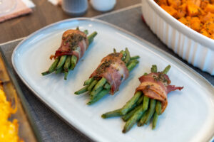 Preheat the oven to 400 F. Mix the dressing in a small bowl and let it set while preparing the bundles. Line a rimmed baking sheet with aluminum foil. Lay 8 to 10 green beans onto the end of a strip of bacon. Roll the bacon tightly around the green beans about one and a half times and trim the excess bacon away. Lay the bundles seam-side down on the baking sheet, leaving plenty of space between each one. Drizzle the dressing over the beans, place the pan in the oven, and bake for 15 to 20 minutes until the bacon is browned crisp and the beans are tender. Makes four to six servings.