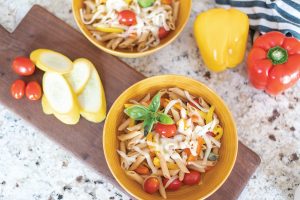 Saute peppers and onion in oil, cooking spray, or butter until tender. Add cooked penne and mix together. Add tomatoes and cook until heated (tomatoes should still have their shape, not mushy). Add seasoning and/or fresh herbs; mix together. Add optional additions if desired. Serve warm. Top with shredded mozzarella, if desired. Makes 8-10 servings.