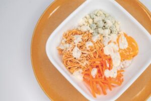 Cook the rice according to the package directions. To assemble the bowls, add some rice, shredded buffalo chicken, and carrots to a bowl. Drizzle with the ranch dressing and top with blue cheese crumbles.