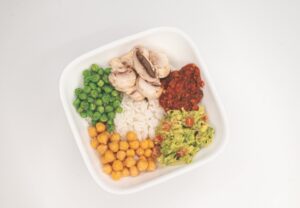 Prepare the rice according to package directions. Heat the cooked rice with the peas, mushrooms, and garbanzo beans until hot. Add guacamole and your favorite salsa. The bowl can be enjoyed with tortilla chips or your favorite other kind of chips.