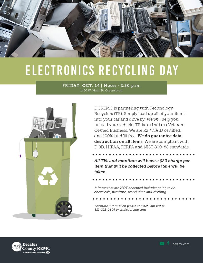 Recycling Day is Oct. 14 By Indiana Connection Posted on Sep 30 2022 in Decatur County REMC Related Stories Unclaimed capital credits Powering progress Join us for Cocoa and Cookies on Dec. 16