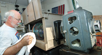 Above photo: From a giant disc called a “platter,” Steve Wilson, owner of the Holiday Drive-In Theatre in Mitchell, begins threading the film of the night’s double feature. The film will run from one platter, through a projector behind him and back to the platter overhead. Each film comes on four reels he must splice together, along with vintage intermission snack bar cartoons, and then wind onto the platters for non-stop running. The drive-in, one of only two dozen left in Indiana, is served electrically by Orange County REMC.