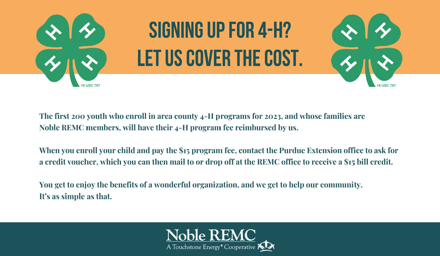 REMC covering the cost of 4-H By Indiana Connection Posted on Nov 08 2022 in Noble REMC Related Stories Reflecting on 2025, building for 2026 API invests and earns cash back Powered by purpose