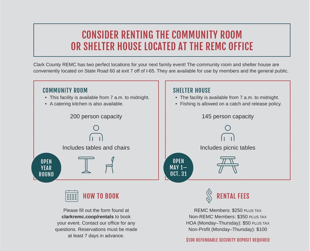 Rent our Community Room or Shelter House By Indiana Connection Posted on Feb 19 2023 in Clark County REMC Related Stories Hoosier Energy advances pollinator habitat conservation efforts Providing reliable service while staying financially strong Donate to our food drive