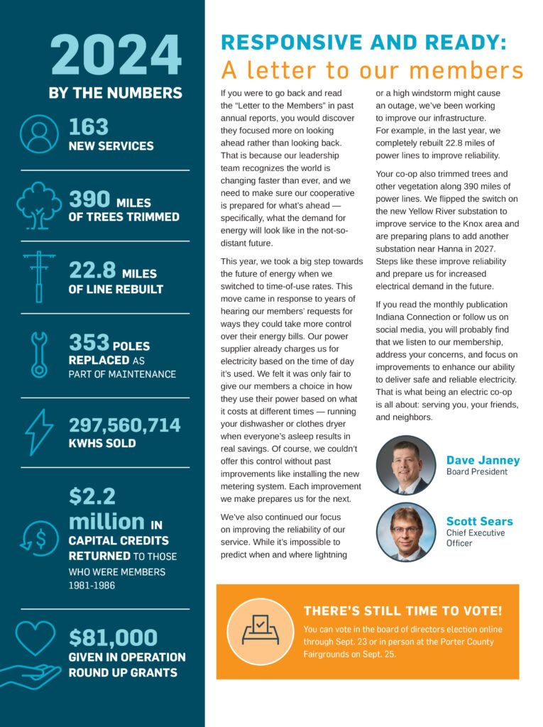 Responsive and ready: A letter to members By Indiana Connection Posted on Sep 03 2025 in Kankakee Valley REMC Related Stories Smart energy choices, shared savings KV REMC 2026 Scholarship opportunities Water heater switch program discontinues Jan. 1