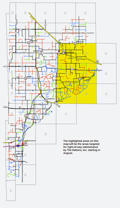 The Daltons, Inc., has been hired for this work. Its focus will be on brush and small woody plant chemical vegetation control in the areas described below and shown on the system map at right. This work has been certified by the Indiana state Chemist and all herbicides used will be EPA-approved. During this spray operation, The Daltons will take care to avoid sensitive areas (such as front yards, tree plantations, ornamental plantings, crops, gardens, lakes, and streams) adjacent to the right-of-way.