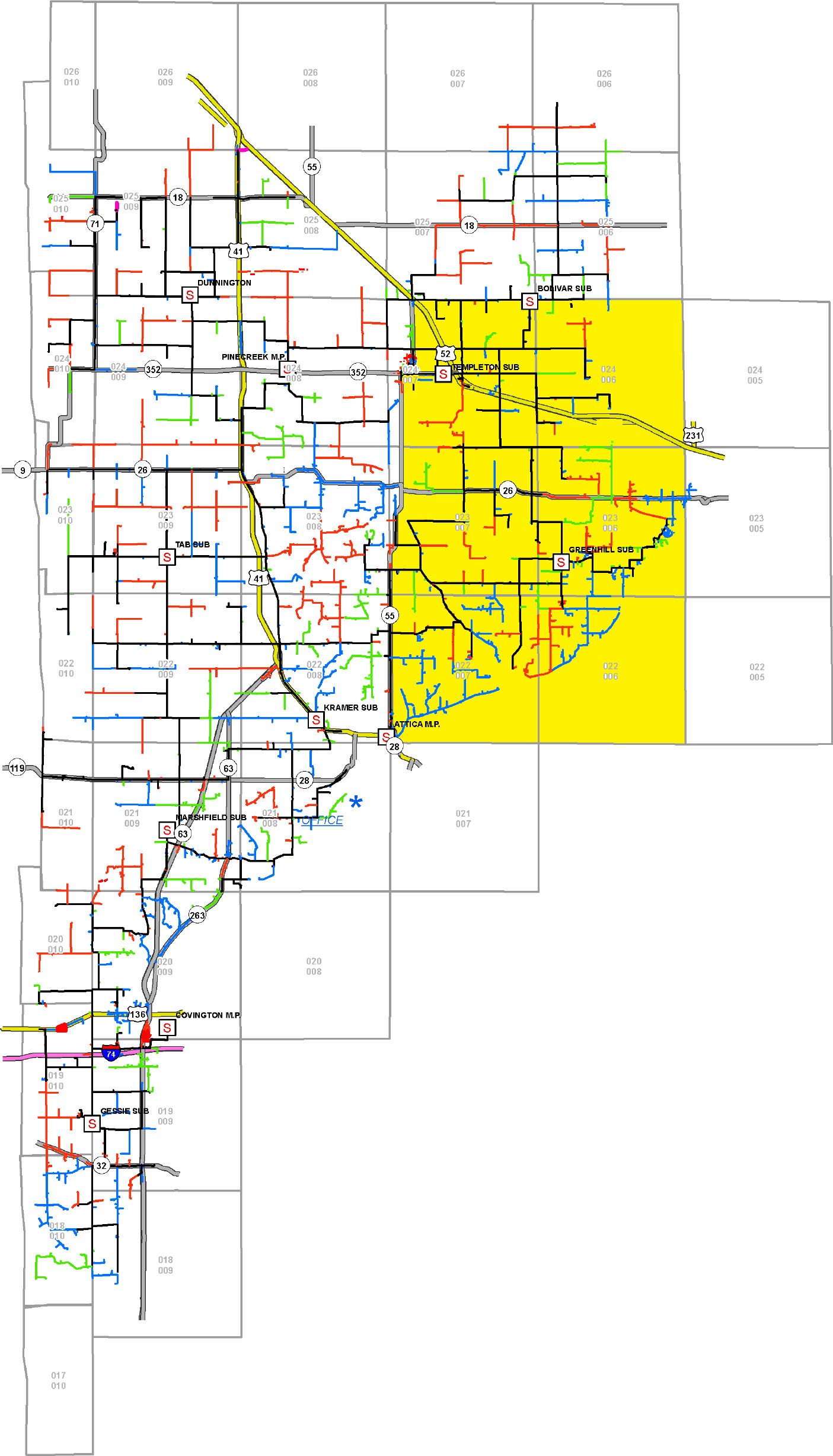 The Daltons, Inc., has been hired for this work. Its focus will be on brush and small woody plant chemical vegetation control in the areas described below and shown on the system map at right. This work has been certified by the Indiana state Chemist and all herbicides used will be EPA-approved. During this spray operation, The Daltons will take care to avoid sensitive areas (such as front yards, tree plantations, ornamental plantings, crops, gardens, lakes, and streams) adjacent to the right-of-way.