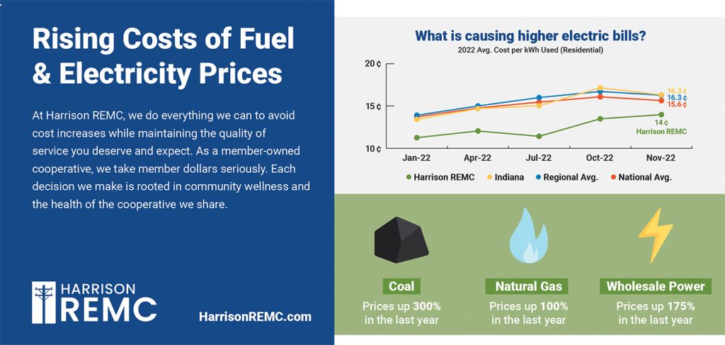 Rising Costs of Fuel and Electricity Prices By Indiana Connection Posted on Apr 06 2023 in Harrison REMC Related Stories A season of gratitude and community Holiday hours 2025 Time of day hours