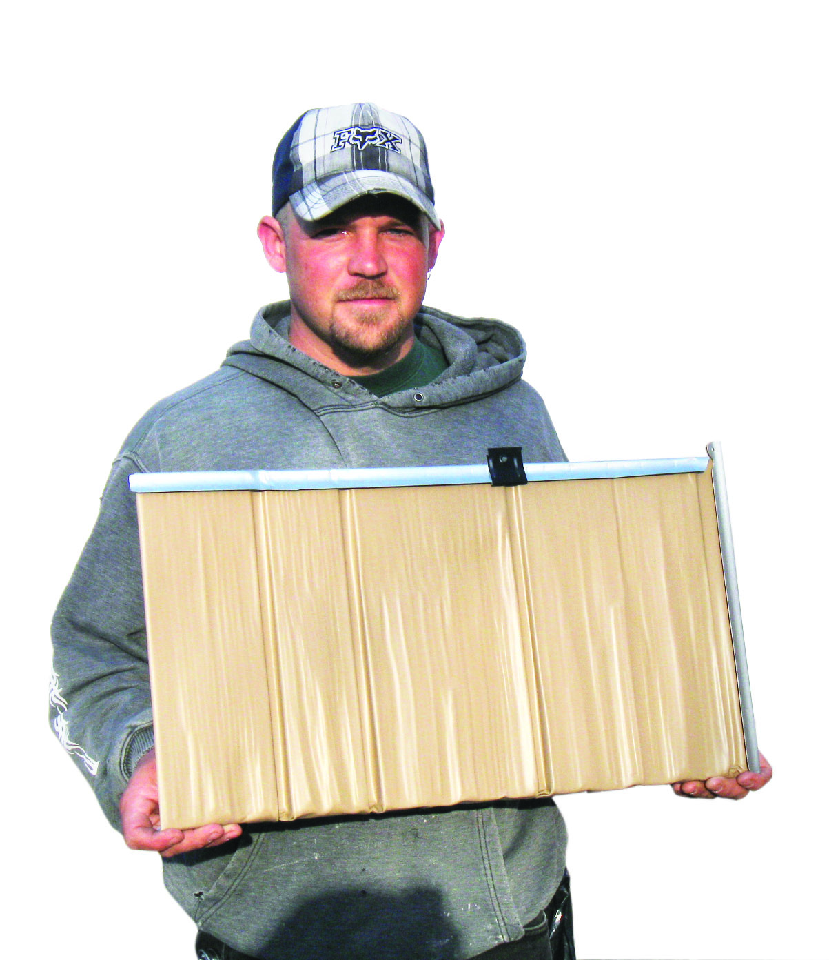 This is a 1×2-foot aluminum-roofing panel with a heat reflecting buckskin colored finish. Notice the inter-locking flanges on the side and top.