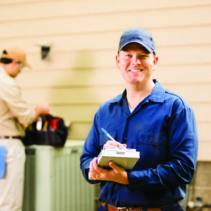 Air conditioner repairmen work on home unit. Blue collar workers. By hhuffman Posted on Jul 05 2025 in