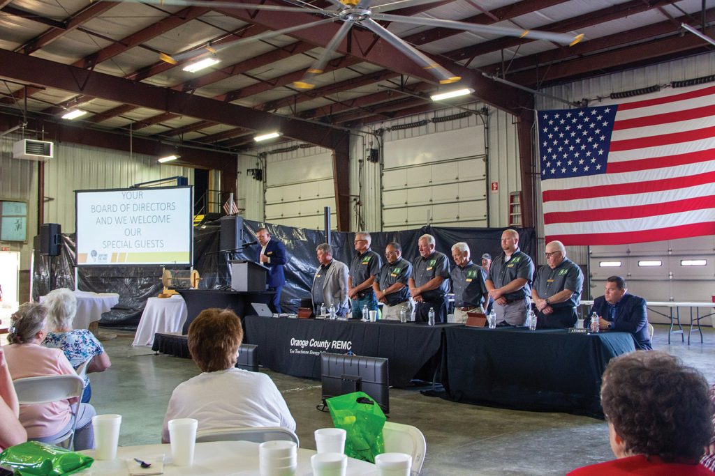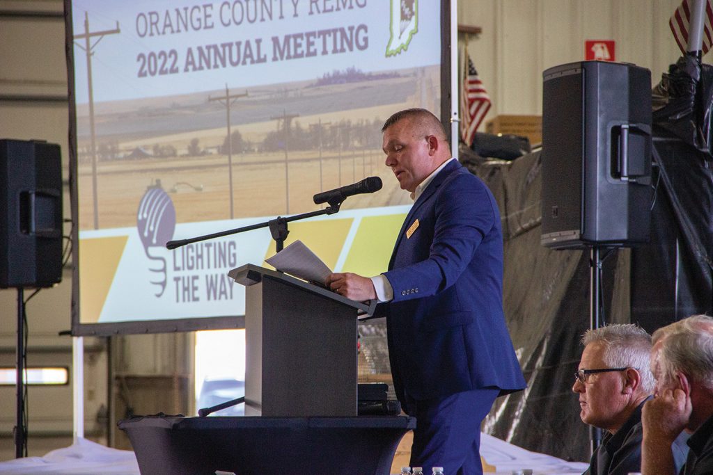 Employees Cade Powers and Ashley McDonald greet members and hand out goody bags at the registration table.REMC members are ready to enjoy some tasty food served up by employees Billy Chastain and Travis Cole. This year, the meal was catered by the Schnitzlebank.Face painting is always a popular part of the kids program.Bounce houses, games and activities kept young members busy during the meeting.Local musician Kirby Stailey provides entertainment before the meeting.The 2022 Annual Meeting was attended by 662 members and their families.CEO and General Manager Matt Deaton addresses the crowd during the business meeting.REMC Board President George Key awards the grand prize to Robert Finley of Orleans.CEO and General Manager Matt Deaton introduces the REMC Board of Directors and special guests attending the annual meeting.