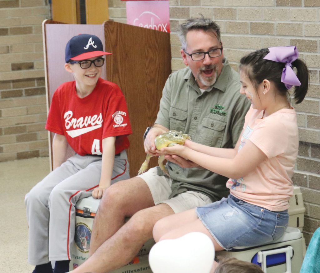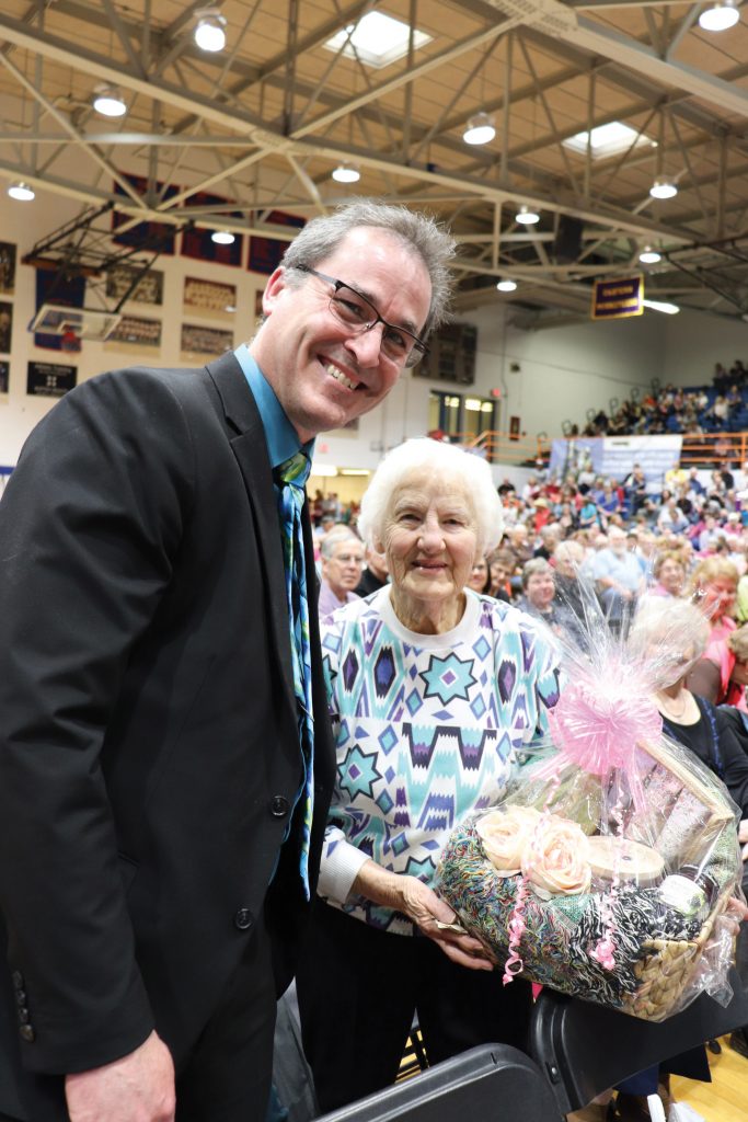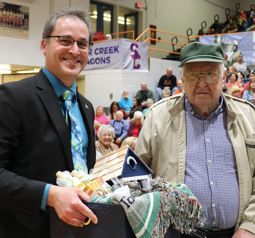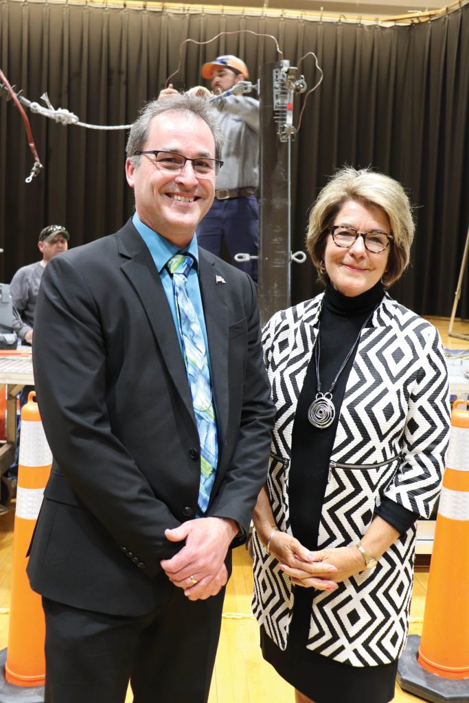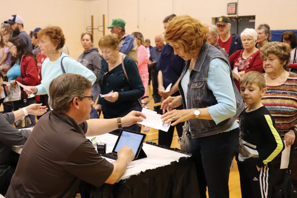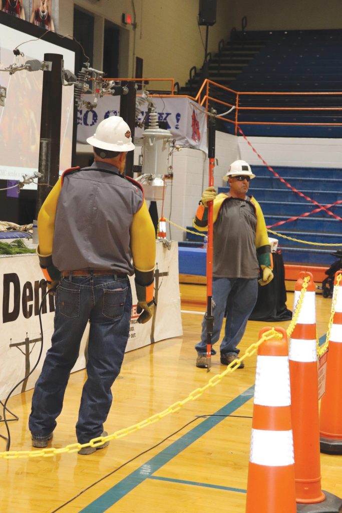 Members register at the annual meeting. Directors elected at the annual meeting were, from left, Steve Dieterlen and Candy Meyer. Solar Sam entertained members of all ages at the annual meeting. The oldest gentleman’s award went to Robert Riall, 93. Board President Steve Dieterlen presented a gift basket to Riall. Deiterlen presented the oldest lady attending, Florence Renn (age 95), a gift basket. Clark County REMC linemen performed a Live Line Demo for attendees.