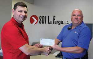 PPEC Energy Advisor Peter Niagu, left, presents a $11,600 lighting rebate to SDI La Farga Operations Manager Jerry Evans, right.