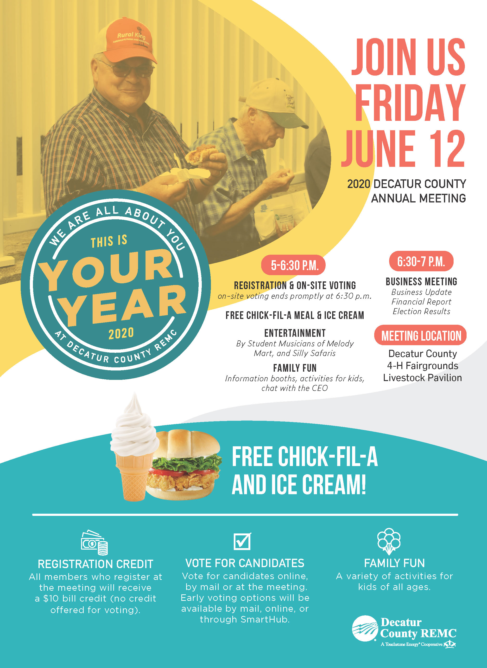 See you at your annual meeting! Decatur County REMC Annual Meeting is June 12 By Indiana Connection Posted on Mar 31 2020 in Decatur County REMC Related Stories Unclaimed capital credits Powering progress Join us for Cocoa and Cookies on Dec. 16