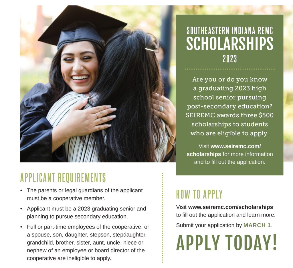 SEI REMC scholarships available By Indiana Connection Posted on Jan 15 2023 in Southeastern Indiana REMC Related Stories Advancing amid challenges Celebrating National Co-op Month UNDERSTANDING THE RATE ADJUSTMENT