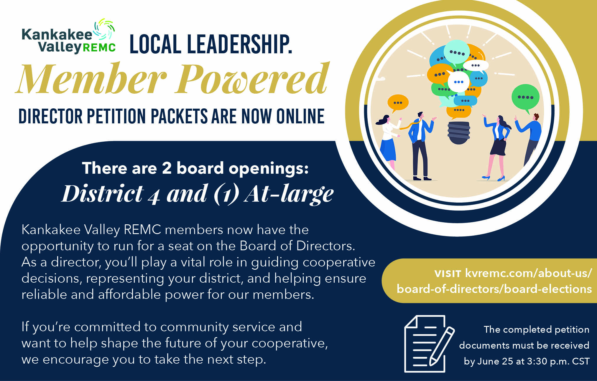 Shape the future of your cooperative by serving on the board of directors By hhuffman Posted on Mar 02 2026 in Kankakee Valley REMC Related Stories We can’t control the future, but we can plan for it Junior Board explores legislative process at Statehouse Join 4-H, it’s fun