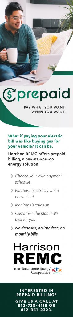 Sign up for our prepaid billing program By Indiana Connection Posted on Aug 31 2021 in Harrison REMC Related Stories A season of gratitude and community Holiday hours 2025 Time of day hours