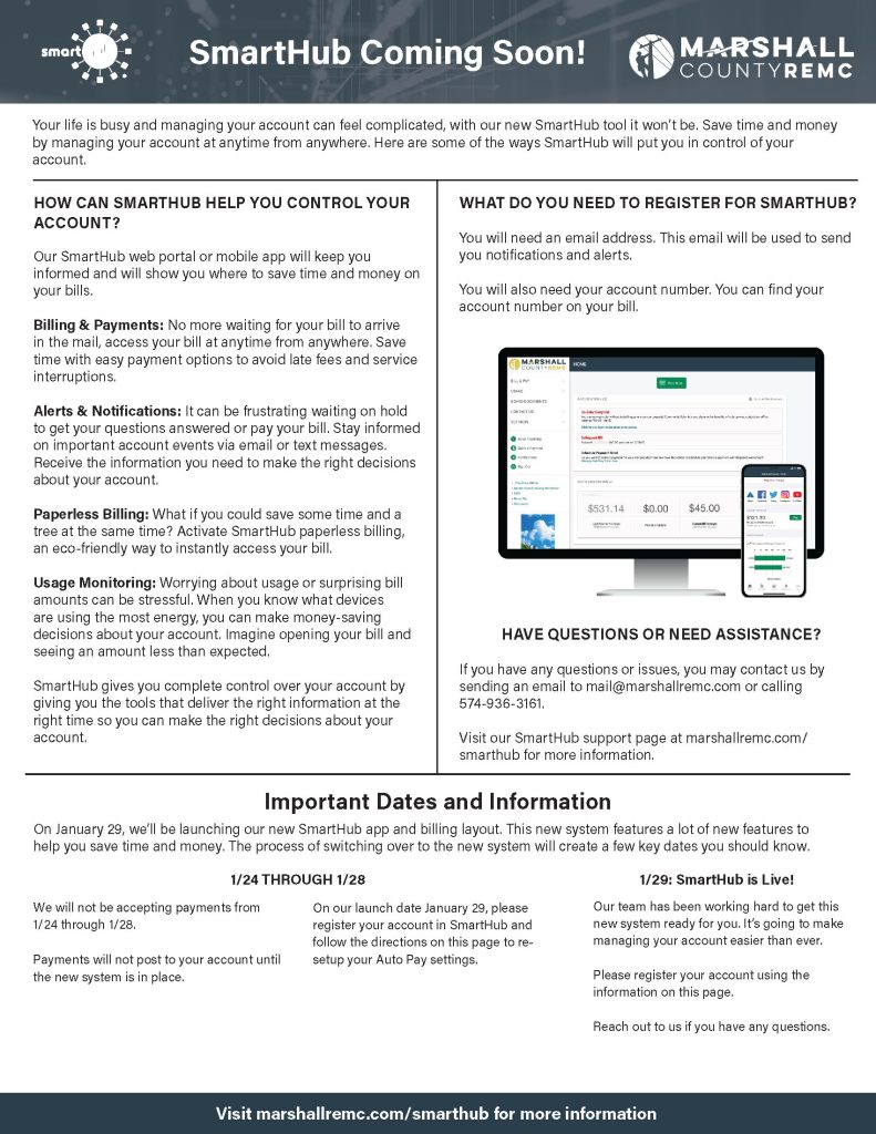 SmartHub is Coming! By Indiana Connection Posted on Nov 06 2023 in Marshall County REMC Related Stories Reflecting on 2025 and looking ahead Be a stellar member: Support our communities through Operation Round up Marshall County REMC 2025 recap